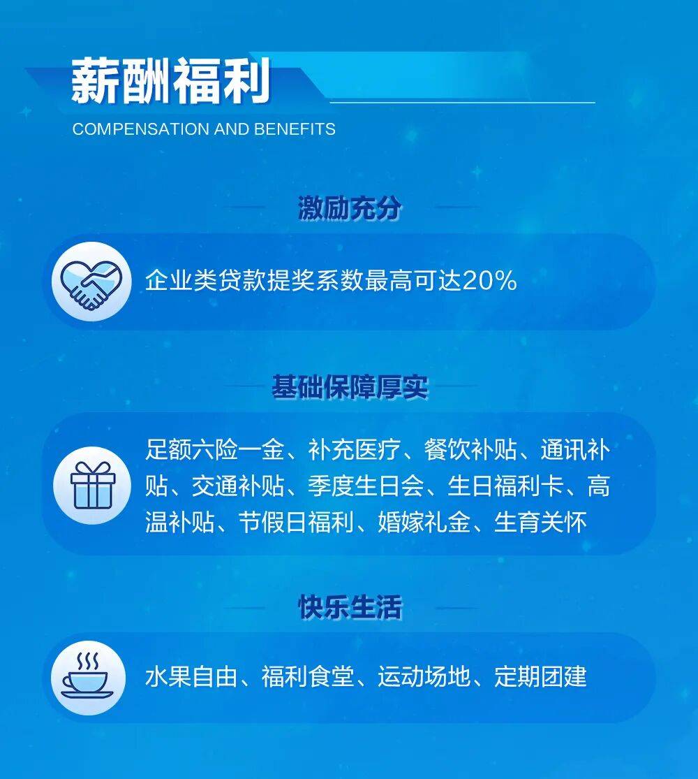 基础保障厚实:足额六险一金、补充医疗、餐饮补贴、通讯补贴、交通补贴、季度生日会、生日福利卡、高温补贴、节假日福利、婚嫁礼金、生育关怀
