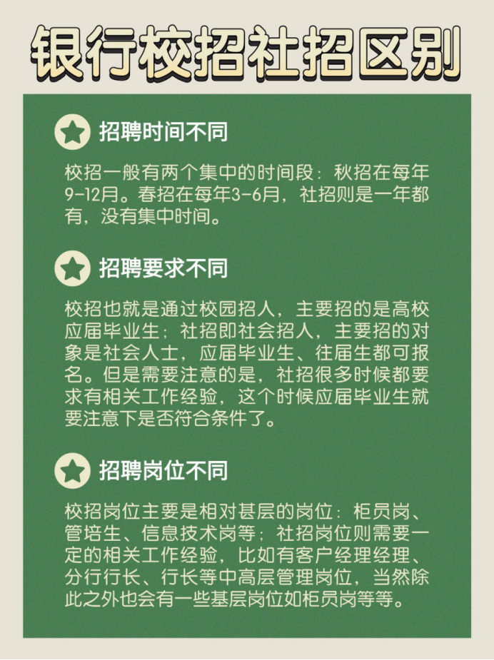第五,招聘方式不同。银行社招主要依靠招聘会、第三方招聘平台以及官方社招公告招聘。校招主要依靠校园宣讲会和官方校招公告发布,同时可能会发布在第三方招聘平台上。
