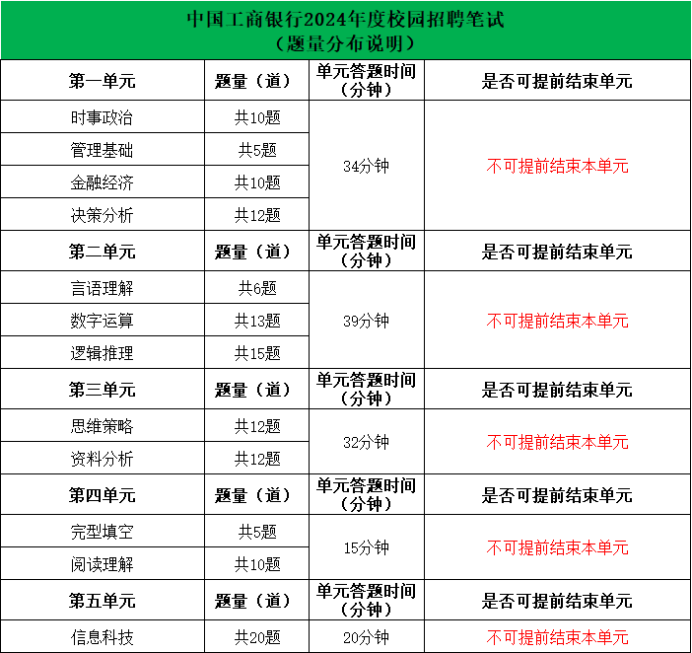 主要分为完形填空,阅读理解;阅读理解必考,完形填空和词汇语法有变化,但是都是考察对语法和词汇的掌握程度。工行的英语题量占比基本为六大国有银行中最低,每年都是15-20道题左右,阅读的词汇量和试题难度基本略低于英语六级阅读。