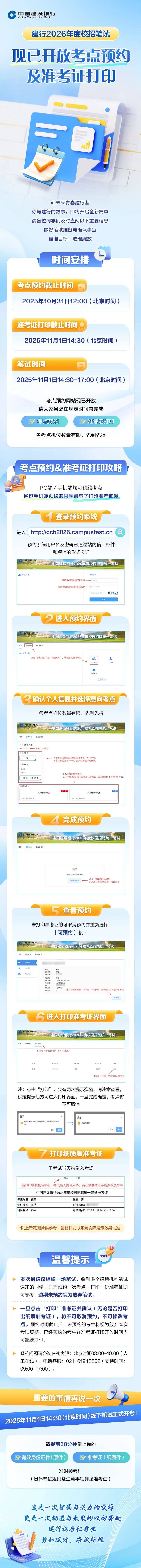 我行2026年度校园招聘统一笔试将于北京时间2025年11月1日14:30-17:00在全国64个城市同时进行。我行将向按要求确认参考的应聘者开放预约考点及打印准考证系统,并发送在线性格测评通知。现将有关事项公告如下。