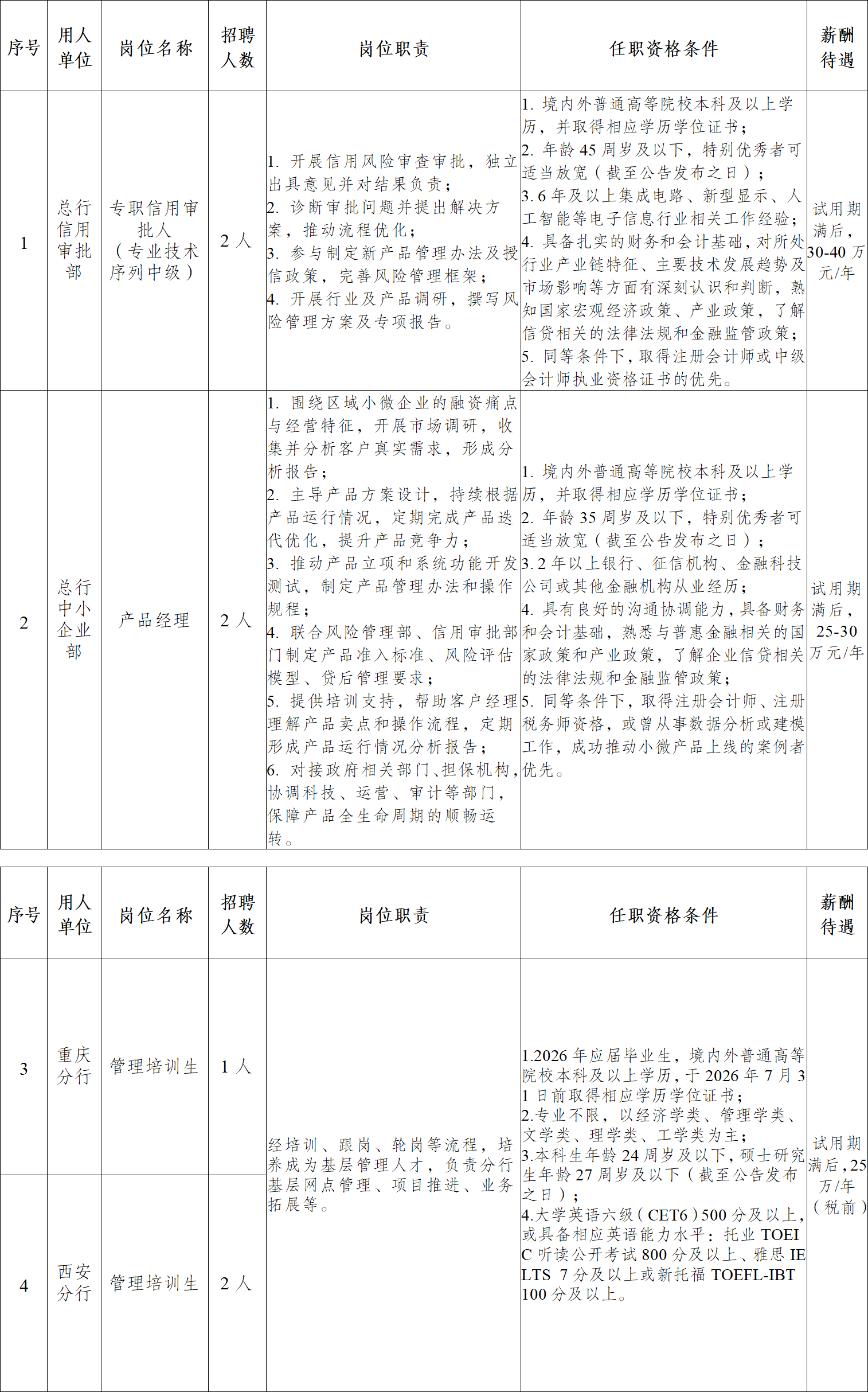 因业务发展需要,成都银行现公开招聘总行信用审批部专职信用审批人、总行中小企业部产品经理、重庆分行管理培训生、西安分行管理培训生,期待您的加入!