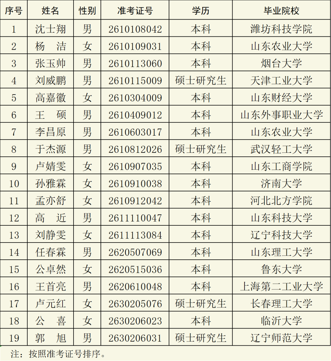 根据《山东辖内农村商业银行2026年度高校毕业生招聘公告》,考生通过笔试、面试和体检等程序,进入背景调查环节,现予以公示: