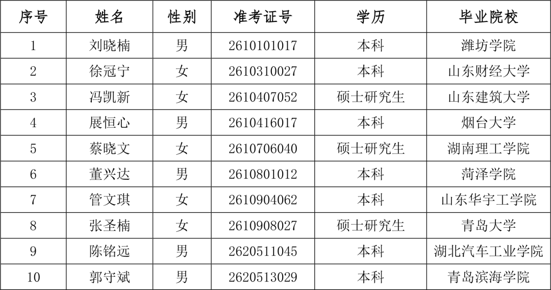 根据《山东辖内农村商业银行2026年度高校毕业生招聘公告》,考生通过笔试、面试和体检等程序,进入背景调查环节,现予以公示: