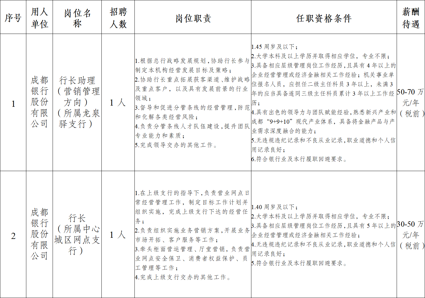 因业务发展需要,成都银行现市场化选聘龙泉驿支行行长助理1人、中心城区网点支行行长1人,期待您的加入!